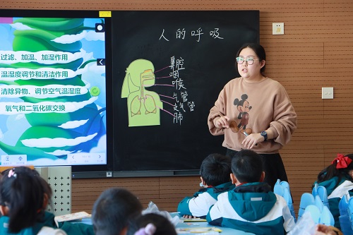 接着,周梦怡老师进行了《人的呼吸》的教学展示。周老师用有趣的小游戏激发学生学习兴趣,与学生一起探究人体呼吸系统的奥秘,利用制作模型的方式培养学生积极动脑、乐于探究的科学精神。