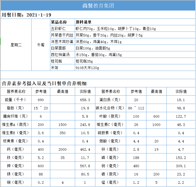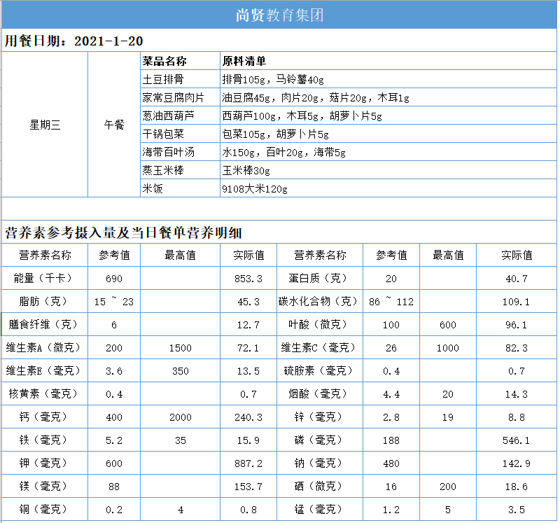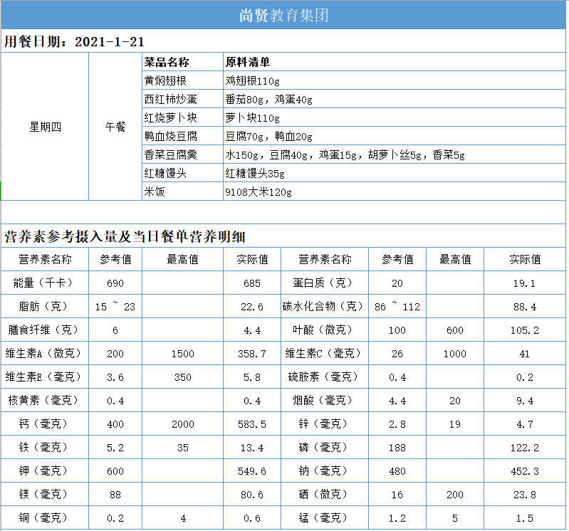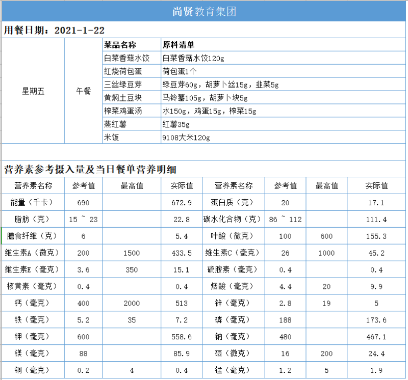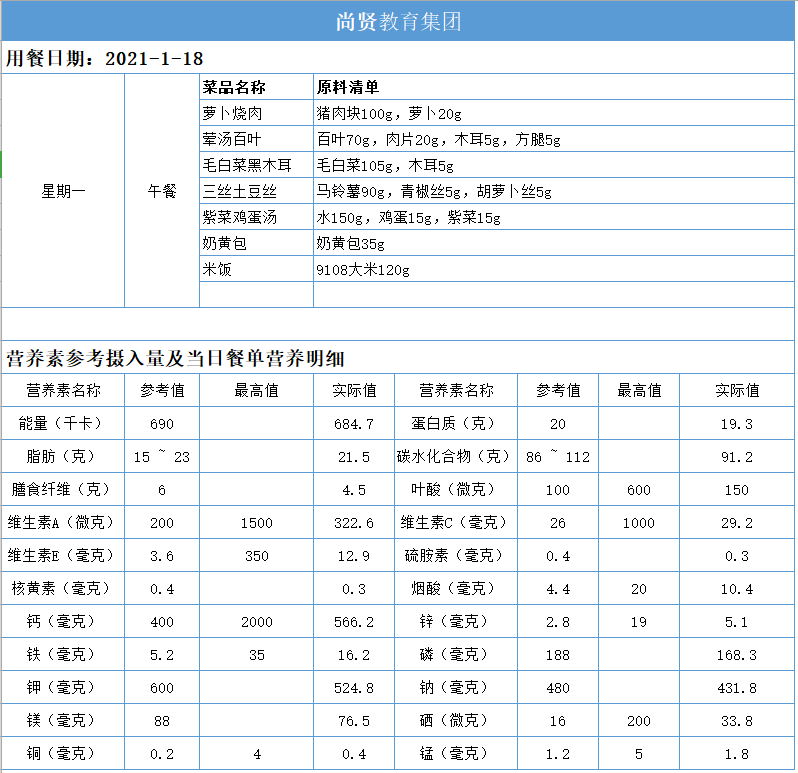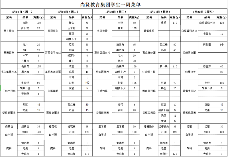 尚贤教育集团一周学生菜单(2021.01.18-01.22)