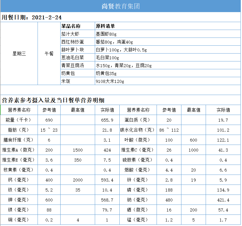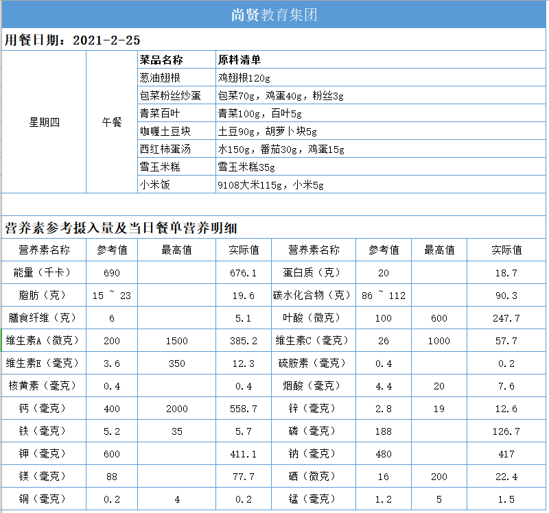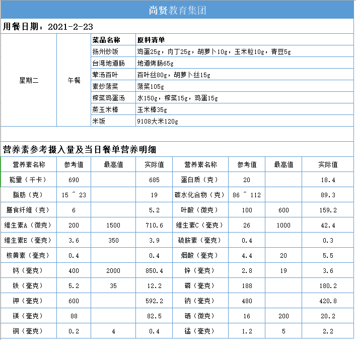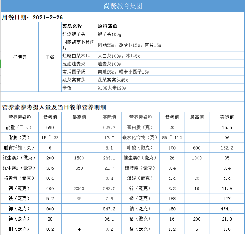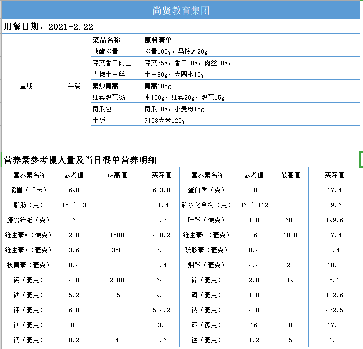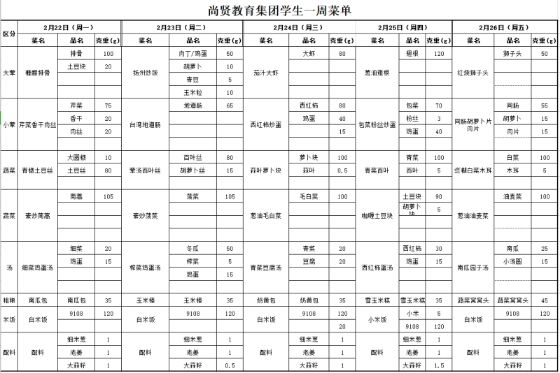 尚贤教育集团一周学生菜单(2021.02.22-02.26)