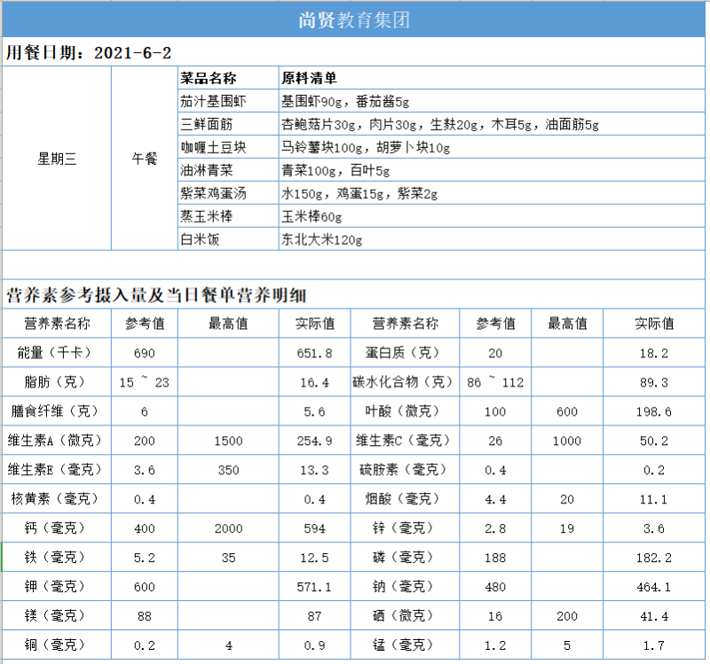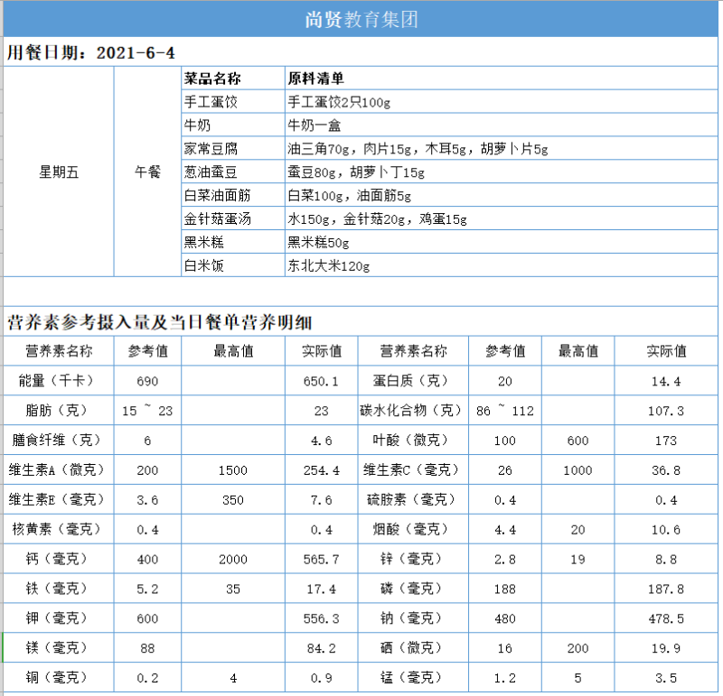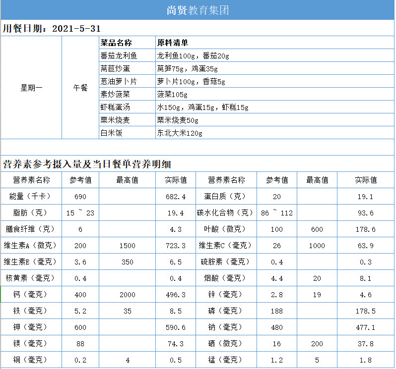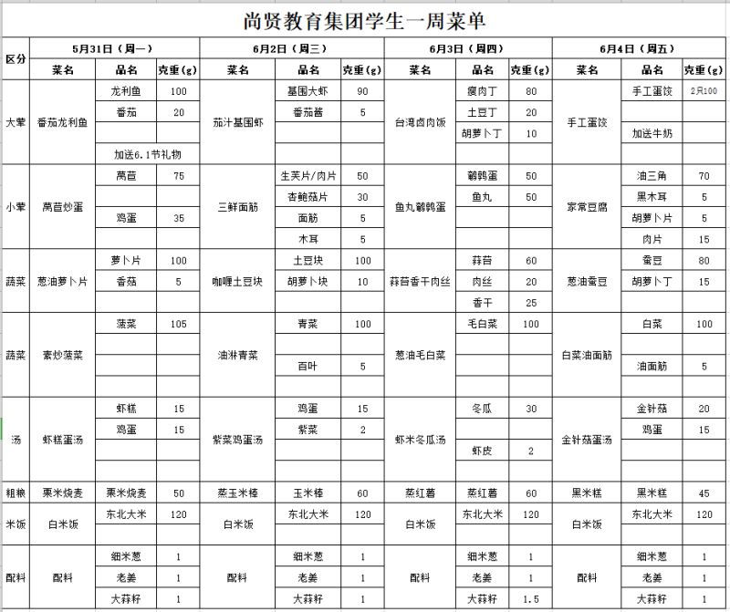 尚贤教育集团一周学生菜单(2021.05.31-06.04)
