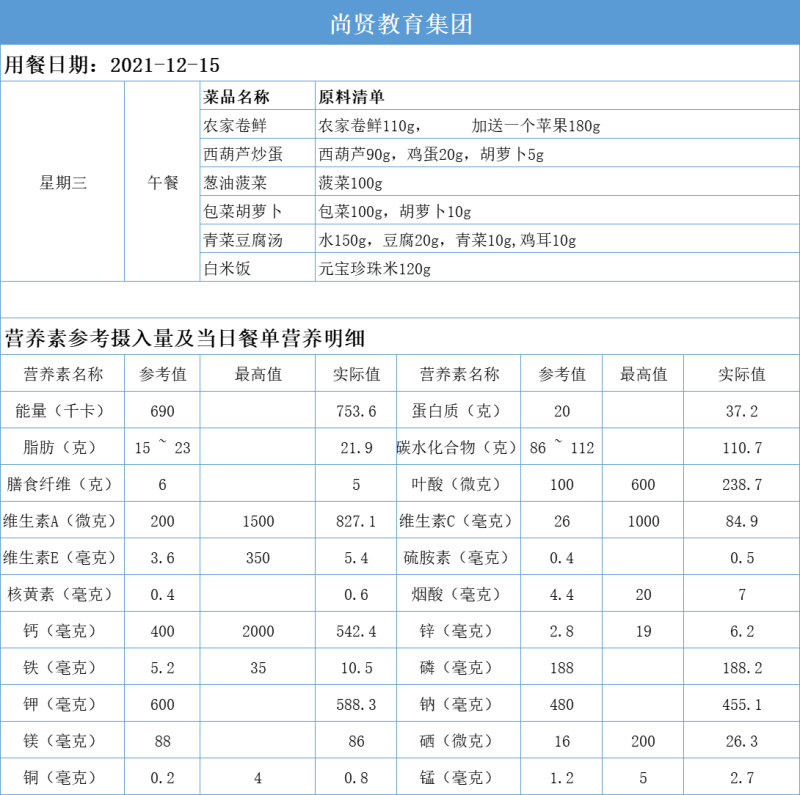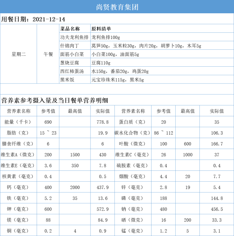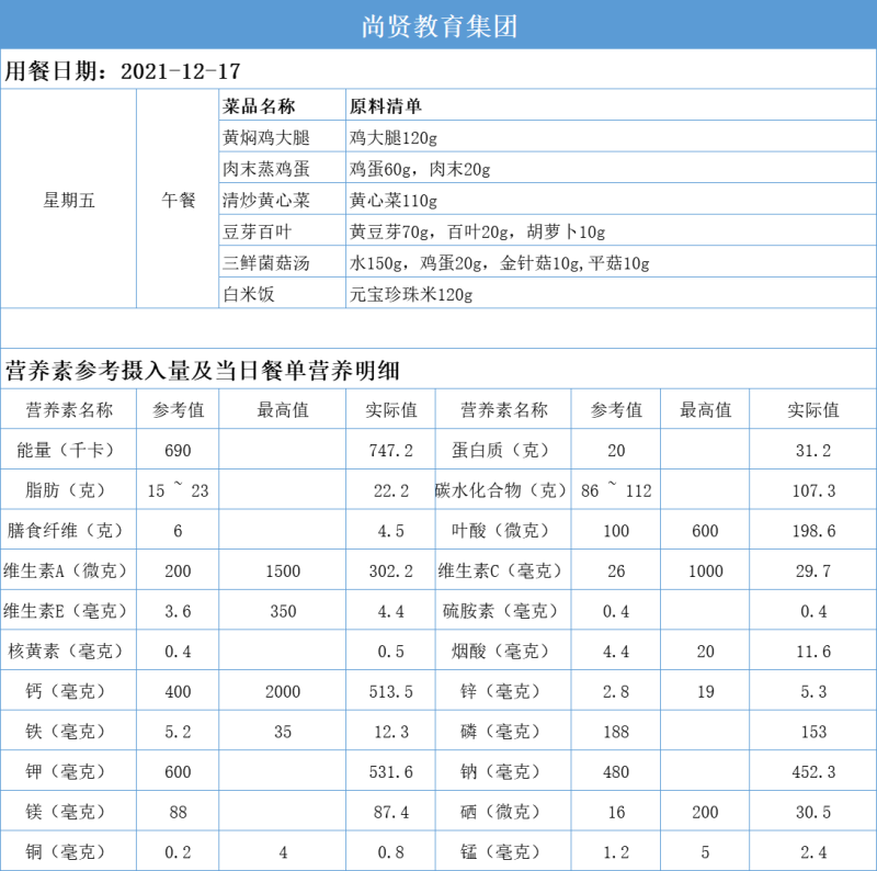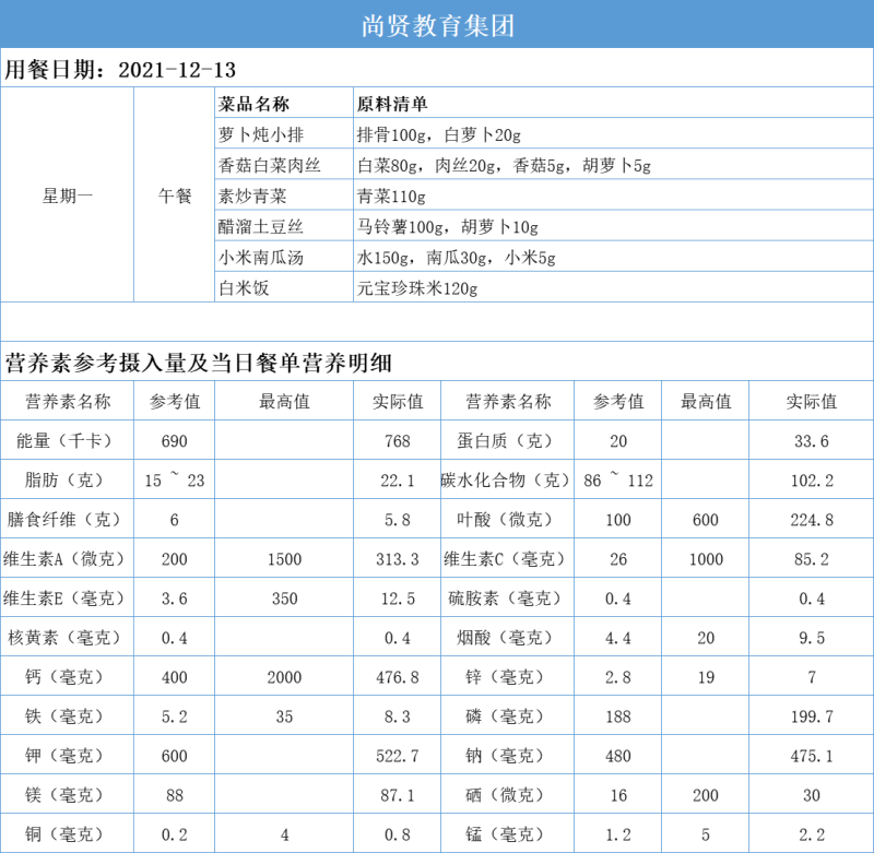 尚贤教育集团一周学生菜单(2021.12.13-12.17)